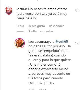 Pero Laura Acuña no se quedó atrás y le contestó: “no debes sufrir por eso… la gente se «empelota» (qué fea esa palabra) cuando quiere y para lo que quiere. Una mujer como tú debería expresarse mejor… pareces muy decente en tus fotos, pero cuando escribes, poco… besos, que este año te trate de maravilla”.