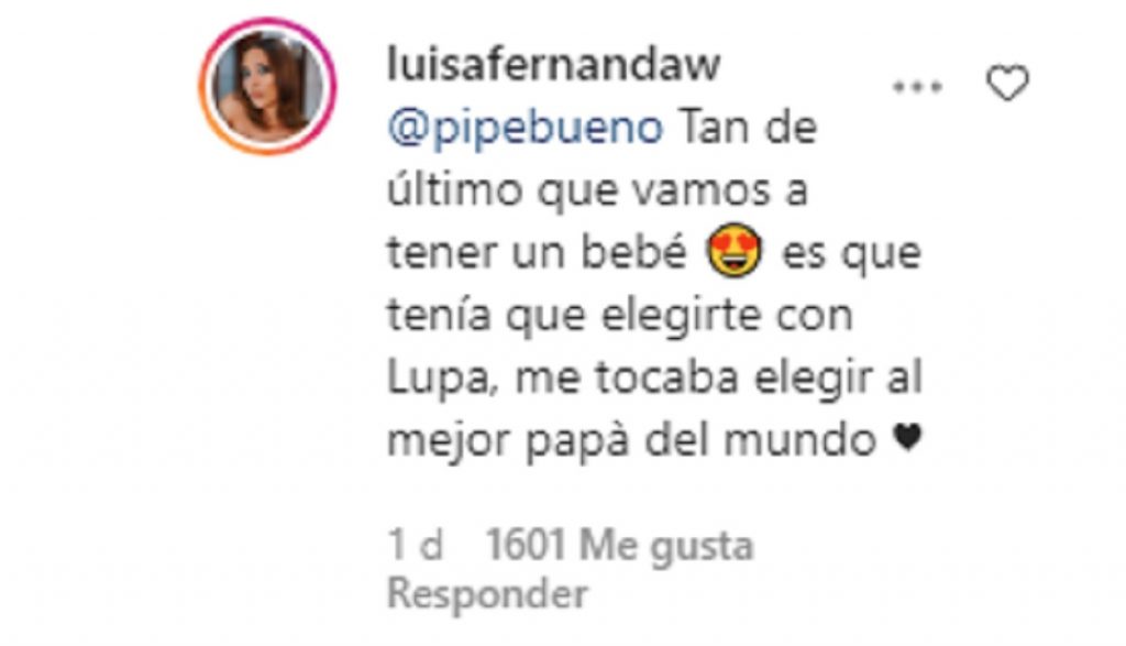 En respuesta a este comentario la influenciadora colombiana señaló: “@Pipebueno tan de último que vamos a tener un bebé, es que tenía que elegirte con lupa, me tocaba elegir al mejor papá del mundo”.