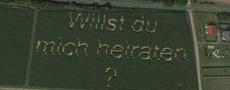 Steffen Schwarz, un alemán de 32 años que ama la agricultura, plantó un campo de maíz en Hüttenberg para que se formara la pregunta ¿Willst du mich heiraten? (¿quieres casarte conmigo).