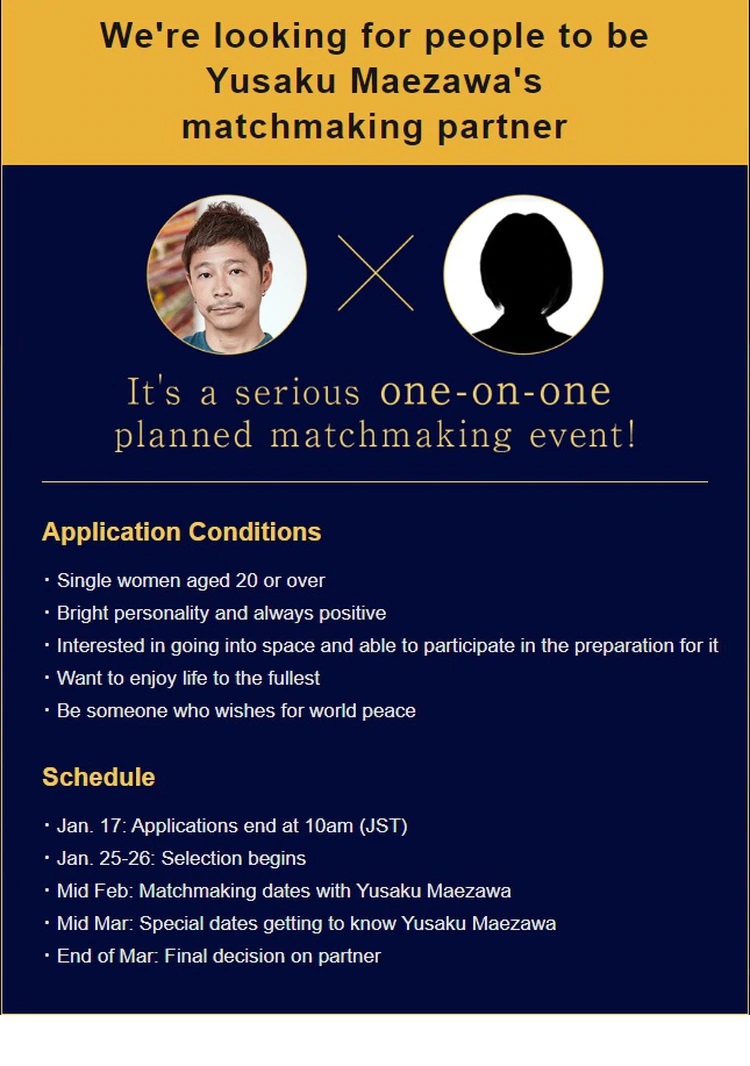 Maezawa, que recientemente anunció la ruptura de la relación que mantenía con una actriz japonesa, acepta propuestas de “solteras de 20 años o más” que quieran disfrutar de la vida al máximo.