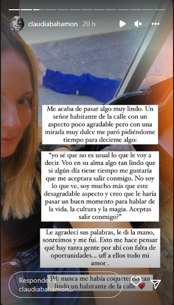 “Un señor habitante de calle con un aspecto poco agradable pero con una mirada muy dulce me paró pidiéndome tiempo para decirme algo: yo sé que no es usual lo que le voy a decir. Veo en su alma algo tan lindo que me gustaría que me aceptara salir conmigo. No soy lo que ve, soy mucho más que este desagradable aspecto y creo que le haría pasar un buen momento para hablar de la vida, la cultura y la magia. Aceptas salir conmigo”, dijo el misterioso sujeto.