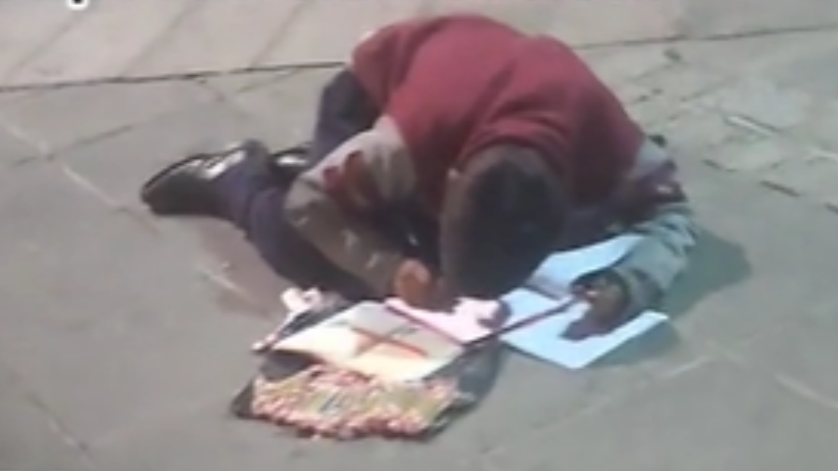 La mujer que grabó al niño escribió “qué afortunados son los que su mami y su papi les dan todo”, mientras se acercaba al niño, que escribía en unas cartulinas en el piso, donde también tenía expuestos los dulces que vende.