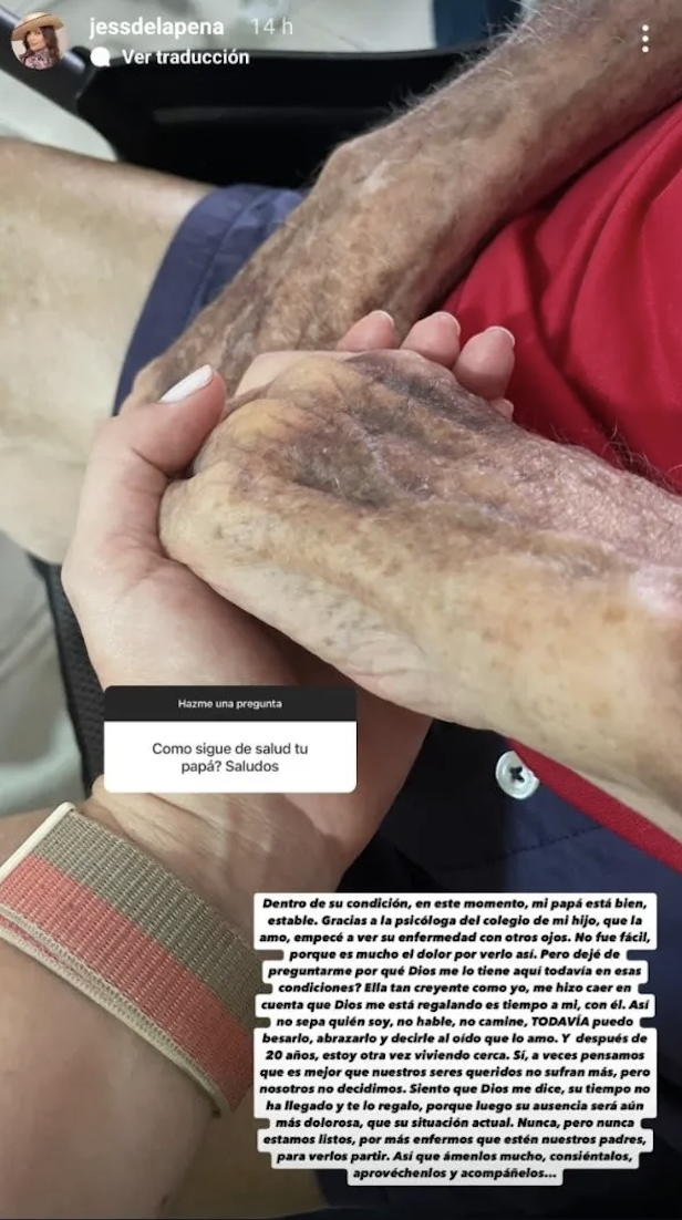 Por ahora, su padre no puede hablar en algunas ocasiones, no camina con facilidad y es difícil que reconozca a sus familiares. Pese a eso, ella agradece poderlo tener cerca y disfrutar de su compañía todos los días, por lo que esto le trae múltiples alegrías a su vida.