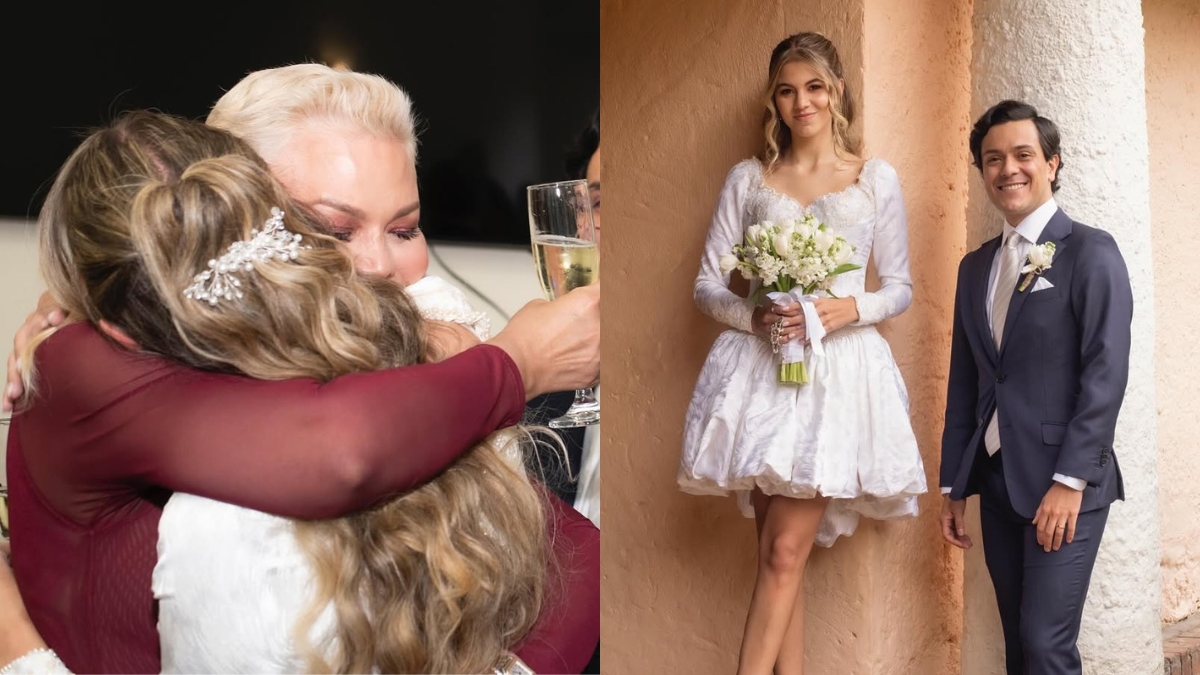 “Unos días antes de nuestro matrimonio en Grecia, decidimos casarnos en una ceremonia católica íntima y llena de muchísimo sentimiento”, confesó en su cuenta de Instagram, donde también detalló que solo estuvieron acompañados de sus papás, hermanos y abuelos, y que además utilizó un vestido que tiene una gran carga emocional porque se trata del mismo que usó su mamá, Paula Ceballos, hace 28 años cuando se casó con Carlos Calero.