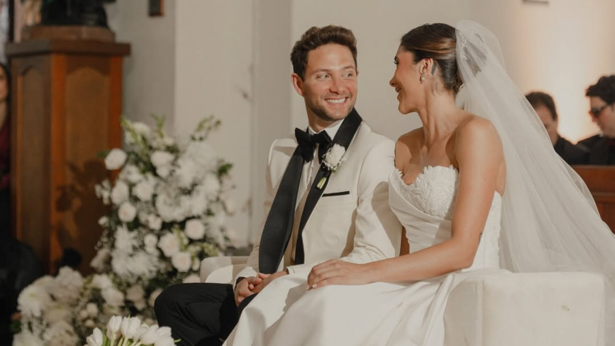 Daniela Ospína lució un vestido de corte princesa con escote corazón y velo tradicional, mientras que Gabriel Coronel vistió un traje en tonos claros con detalles oscuros.