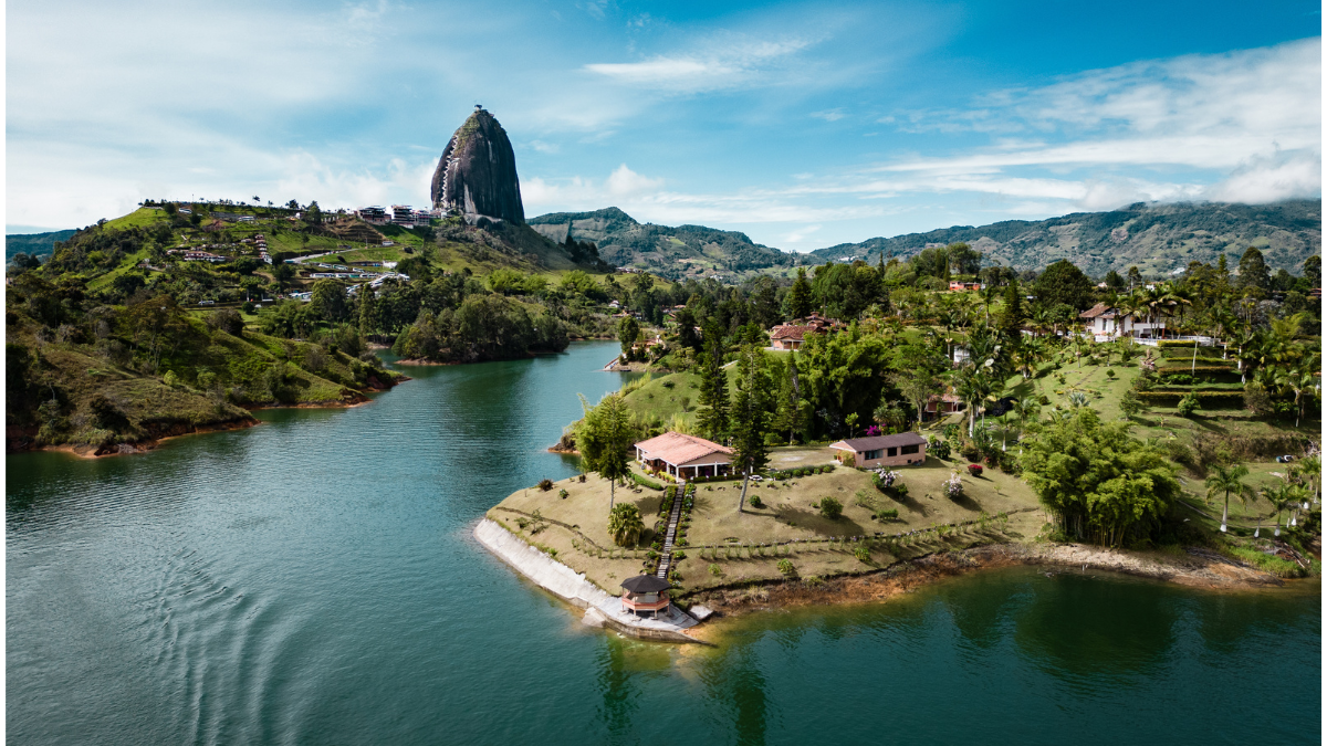 Los 740 escalones de la Piedra del Peñol te dan la mejor vista de Antioquia; el contraste del agua turquesa con el verde de las colinas es único en el mundo. Si quieres algo más privado, muchos hoteles ofrecen habitaciones con muros en cristal frente al embalse. Además, podrás hacer un recorrido en lancha o alquilar un kayak para ver el amanecer.