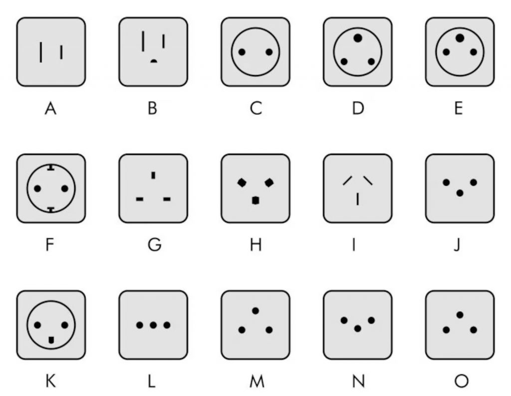 Alrededor del mundo existen 15 tipos de enchufes, identificados con las letras que van de la A a la O, tal como se muestra en la imagen a continuación. Cada uno presenta características y funciones específicas, además de utilizarse en distintas regiones del planeta según las normas eléctricas de cada país.